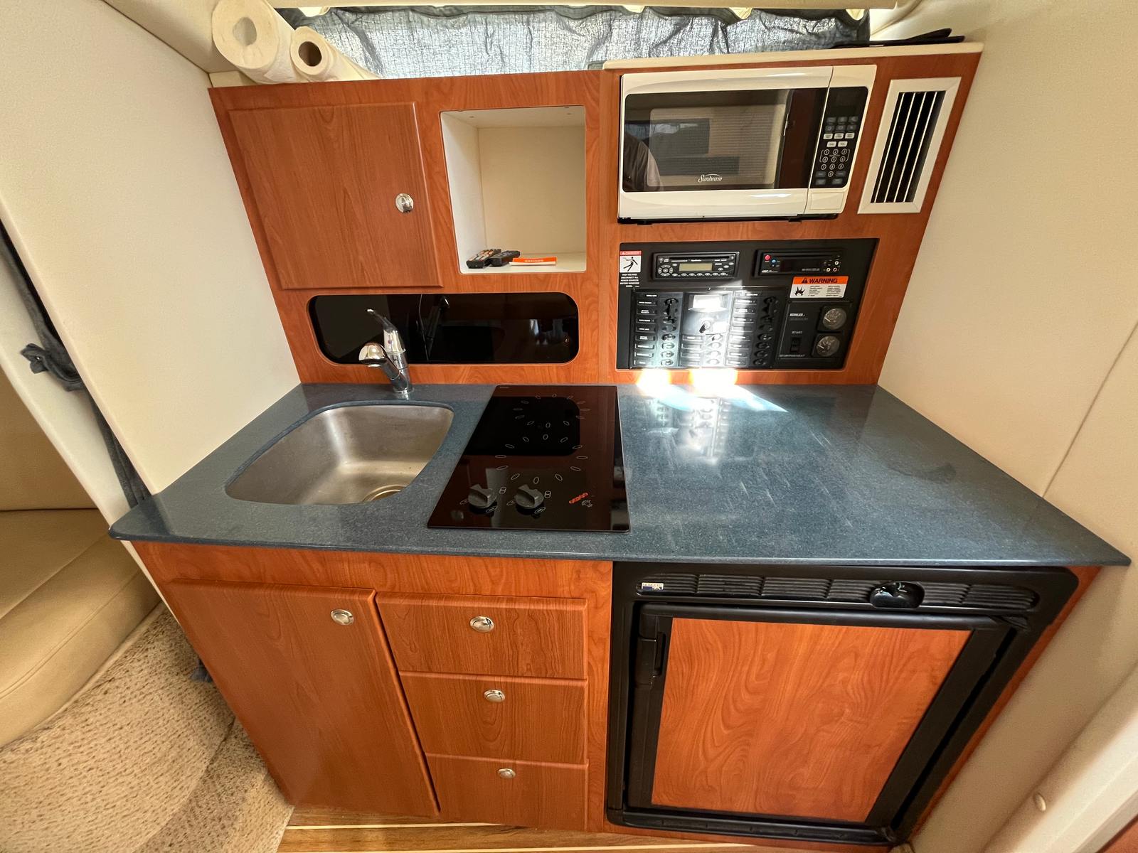 The 2006 Bayliner 325 Cruiser is thoughtfully designed to enhance your time on the water. Its spacious layout provides ample room for entertaining, relaxing, and enjoying the company of friends and family. The cockpit area is perfect for socializing, with comfortable seating and easy access to all areas of the boat. The interior is equally inviting, offering a welcoming space to unwind after a day of adventure. Every detail is crafted to maximize comfort and convenience, making this Bayliner boat for sale a true home away from home.