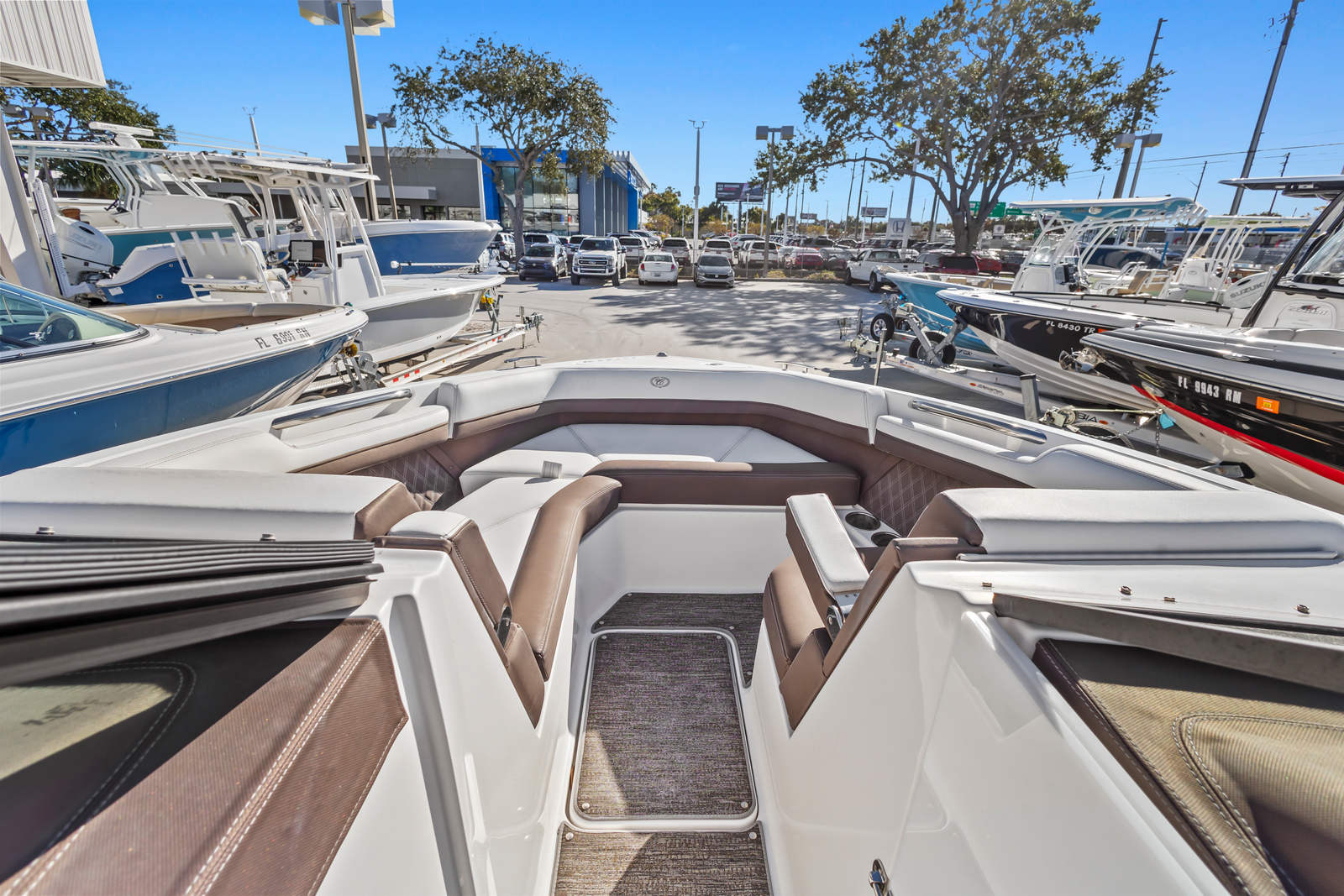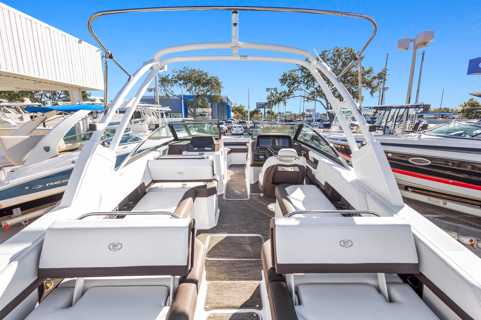 Well-equipped for entertaining and cruising, this boat features dual in-dash Garmin multifunction displays, JL Audio sound system, electric windlass anchor, trim tabs, and an aluminum arch with integrated Bimini top for added comfort and shade. Cobalt’s signature interior layout includes plush wraparound seating, a convertible aft sunpad, and a spacious, enclosed head compartment, all finished with top-tier materials and stitching.