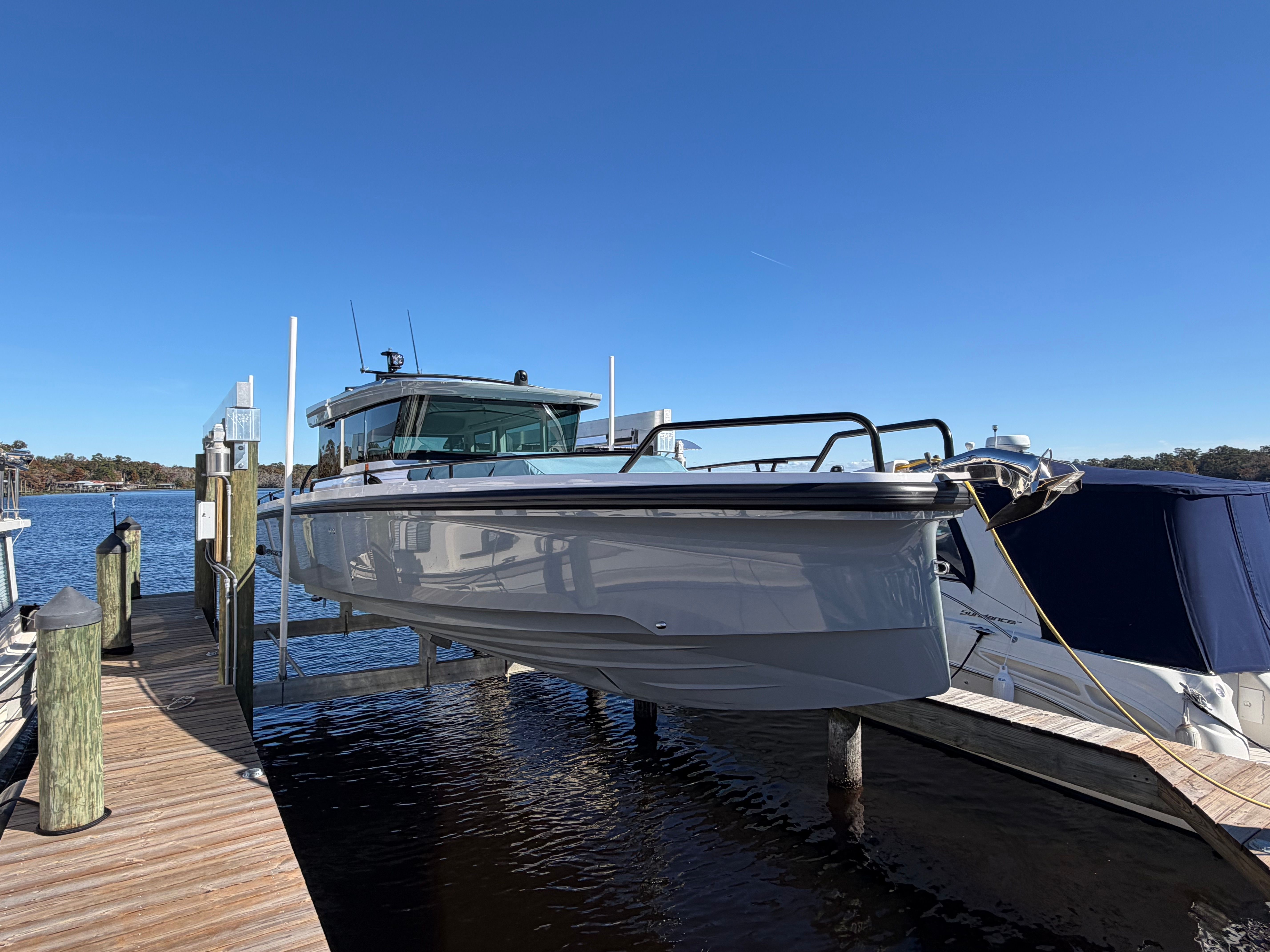 This boat has lived on a lift in the St. Johns River predominantly in fresh and brackish water. This Axopar 37XC has been meticulously maintained