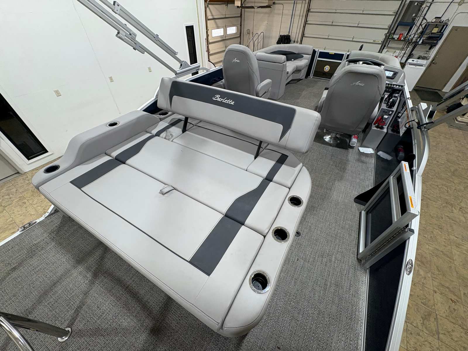 The Barletta Aria A22UC is thoughtfully equipped with a range of features designed to enhance comfort, convenience, and enjoyment on the water. The Triple Toon Package Aria provides added stability and buoyancy, ensuring a smooth and steady ride even in choppier conditions. The in-floor midship storage offers a practical solution for stowing gear, water toys, and personal items, keeping the deck clutter-free and organized. The furniture, finished in Tempest Gray, exudes sophistication and comfort, inviting you and your guests to relax in style. The flooring, crafted from Amore Gray material, is both durable and visually appealing, complementing the overall aesthetic of the boat. The rig engine with standard prop ensures reliable propulsion and efficient performance, making every journey effortless and enjoyable.