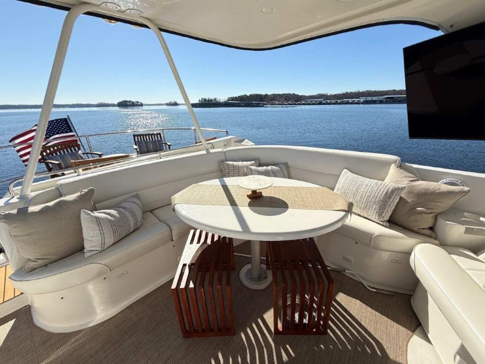 Below deck, the yacht features a three-stateroom layout, generous pilothouse seating, and a full-beam master suite, making her ideal for extended cruising or luxury liveaboard use. Her previous owner brought her down from Tennessee, and she currently resides under cover on Lake Lanier, preserving her freshwater condition.