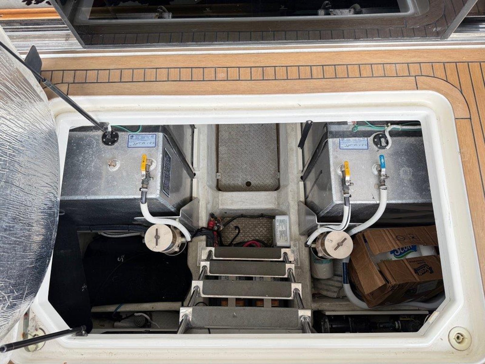 Powered by twin Volvo TAMD74P-D diesel engines (480 HP each) with just over 600 hours, “Ricky Bobby” has been fully serviced by a local mechanic, with service records available. The Onan 12.5kW generator shows 740 hours and runs smoothly. The engine room is exceptionally clean and offers easy access to all systems.