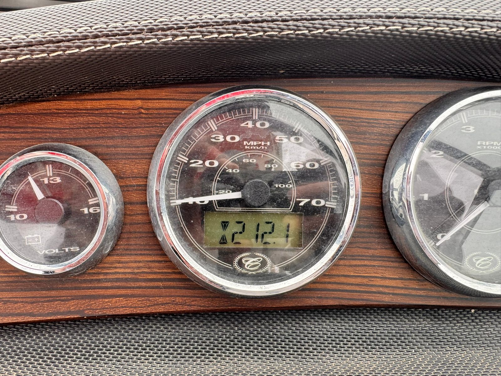 Elegant helm with full instrumentation, including depth finder and air/water temp gauge.