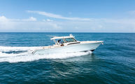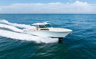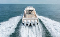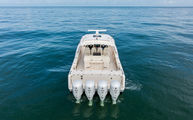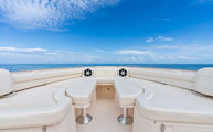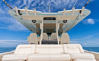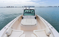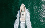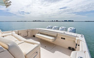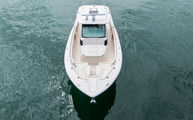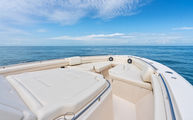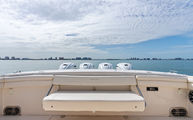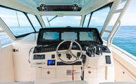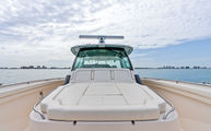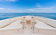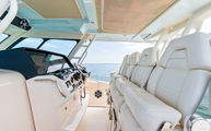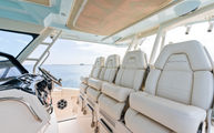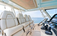 Topside, enjoy dual-zone air conditioning, premium seating with fold-away aft bench, an electric bow table, and an integrated retractable cockpit shade for ultimate comfort while entertaining or relaxing.