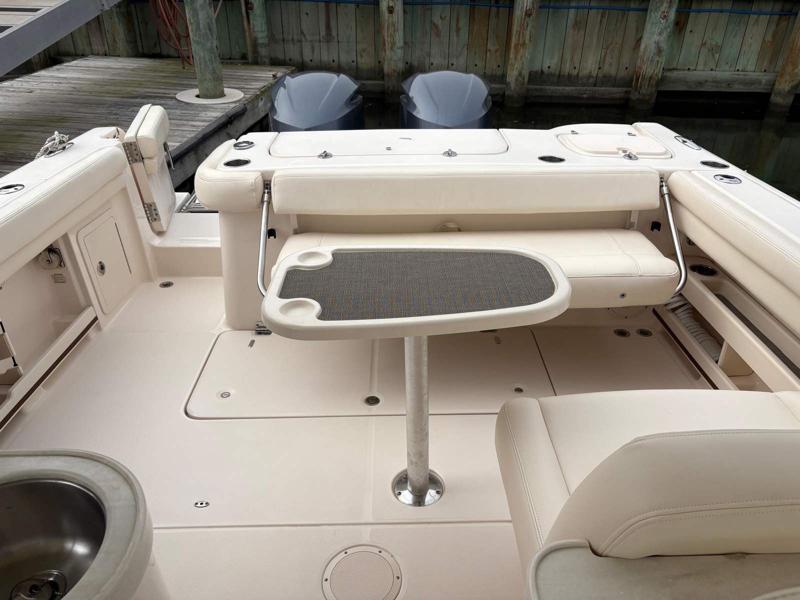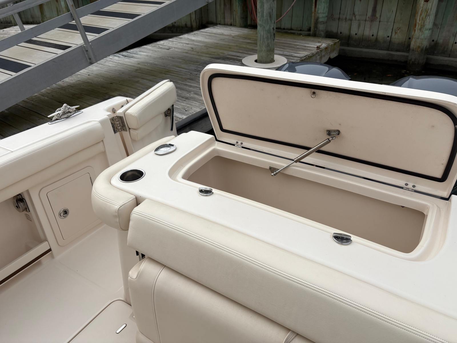 Powered by twin engines delivering a combined 600 horsepower, the Grady-White Freedom 307 offers exhilarating performance and smooth handling. The dual engines provide impressive acceleration, responsive maneuverability, and the confidence to tackle a variety of water conditions. Whether you are cruising along the coastline, heading offshore for a day of fishing, or enjoying water sports with family and friends, this Dual Console boat for sale delivers the power and reliability you need. The robust engine setup ensures that you can reach your favorite destinations quickly and efficiently, making every outing more enjoyable.
