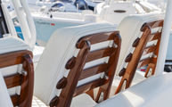 Features and SpecificationsThe Jupiter 40 Center Console is loaded with premium features that elevate your boating experience. The exclusive Teak Package adds a touch of elegance and comfort, featuring a teak helm standing pad on the bridge deck, teak helm foot rest, teak mezz foot rest, and teak bow step pads. These luxurious accents not only enhance the aesthetics but also provide superior grip and comfort for long days on the water.Fishing enthusiasts will appreciate the transom rod holders designed for the triple engine setup, as well as the upgraded cup holders on the stern rod holders. The Gemlux outriggers with deluxe carbon fiber poles are perfect for serious anglers looking to maximize their catch. The hard top underside is finished in Tourmarine Blue Metallic, adding a custom flair to the boat’s striking appearance.Additional highlights include the exterior cover package, which protects key areas such as the helm seat, mezzanine seat, sun pad, and engines. Two pairs of 0° HD Gem stainless steel swivel rod holders with electric reel outlets (Hubbell 30 AMP) provide versatility for various fishing techniques. The quad underwater LED Lumitec Seablaze X Spectrum lighting creates a vibrant ambiance for evening cruises or night fishing excursions. Comfort is further enhanced by a powerful A/C unit, ensuring a pleasant environment no matter the weather.