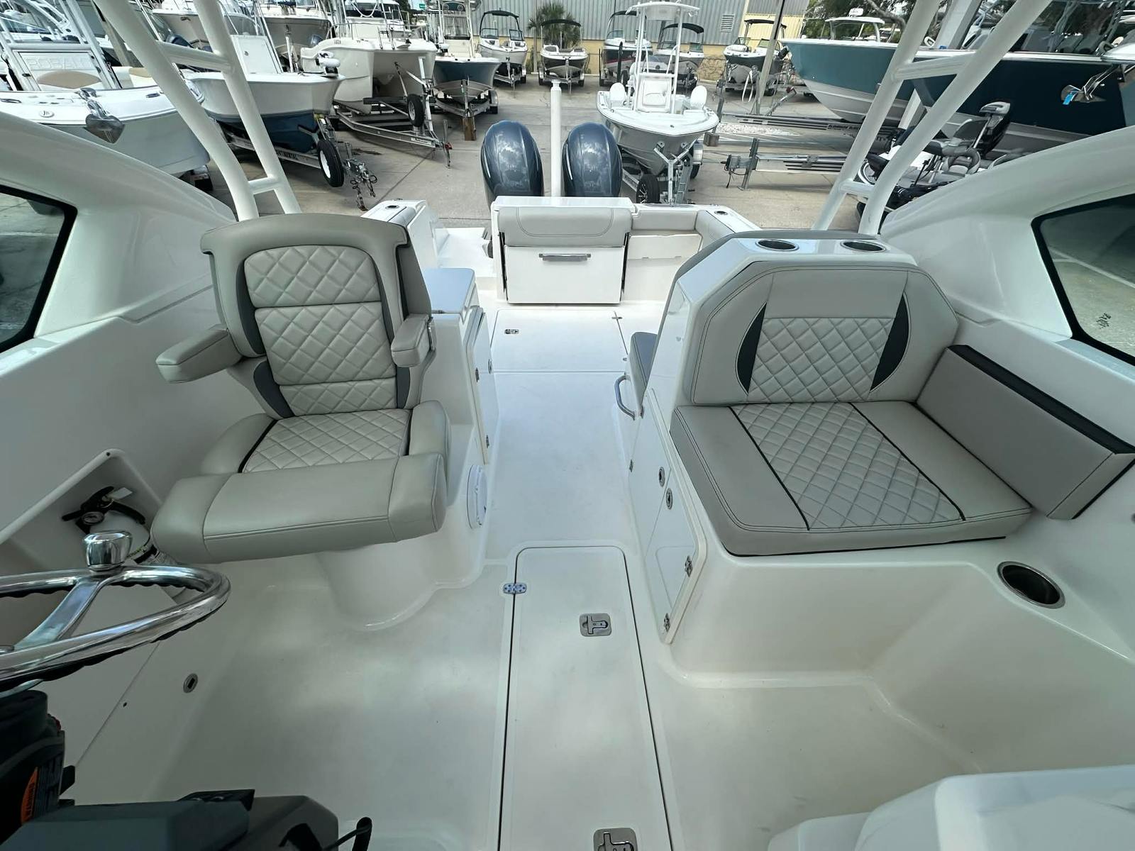 This Dual Console boat for sale is as practical as it is enjoyable. The Pursuit DC 266’s manageable size makes docking and trailering straightforward, even for those new to boating. Its efficient engines help keep fuel costs in check, allowing you to spend more time on the water and less time at the pump. The abundance of storage compartments means you can bring along everything you need for a full day of fun, from fishing rods to picnic supplies.The walk-through windshield and wide beam make boarding and disembarking safe and easy, while the sturdy construction ensures durability in a variety of conditions. Whether you are navigating busy marinas or anchoring in a secluded cove, the Pursuit DC 266 offers the versatility and reliability you need for worry-free boating.